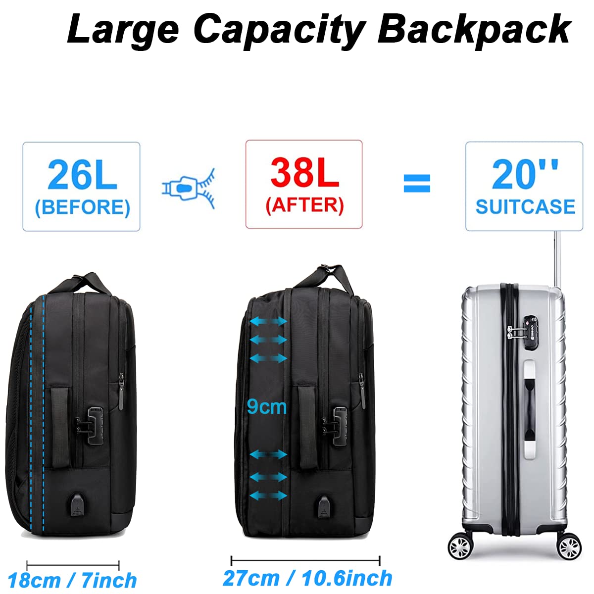 The backpack expands by about 9 cm to unlock its full 38 L capacity—perfect when you switch from office mode to travel mode. Four zipper compartments keep everything in place: a small hidden front compartment, a large front compartment with 5 internal pockets, a main expandable compartment with clothing pocket and padded 17–17.3″ laptop sleeve, and a waterproof side compartment for shoes or wet items. Multiple pockets make it easy to organize gadgets, documents, and accessories so nothing gets lost.